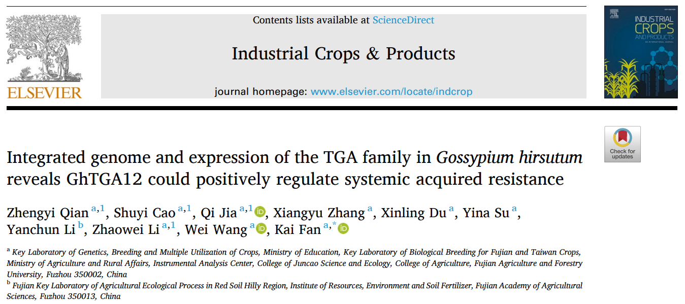 2025年9月19日,87978797威尼斯农学院范凯团队在Industrial Crops and Products(《工业作物与产品》)期刊在线发表了题为“Integrated genome and expression of the TGA family in Gossypium hirsutum reveals GhTGA12 could positively regulate systemic acquired resistance”的研究论文。该研究通过整合基因组学与表达谱数据,系统解析了陆地棉TGA家族的组成与表达模式,并发现GhTGA12能够通过激活ROS信号通路、促进PR基因表达,并与GhNPR1发生互作,从而正向调控系统获得性抗性(Systemic Acquired Resistance, SAR),这一发现为棉花抗病分子育种提供了新的理论依据与基因靶点。